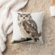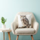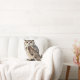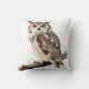 A square pillow featuring a detailed illustration of an owl perched on a branch, with large orange round eyes and intricate feather patterns in shades of brown, white, and gray. The subtle taupe background harmonizes with the neutral tones of the sofa pillows and blanket.