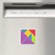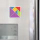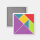 The ancient Chinese tangram puzzle consists of 7 geometric shapes: 2 large triangles, 1 medium triangle, 2 small triangles, 1 square, and 1 parallelogram. The puzzle is shown completed to form a colorful square. I hope you enjoy this tangram magnet.