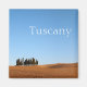 Square magnet of a small group of cypress trees in a small forest between the rolling barren hills in autumn in the Val d'Orcia, Tuscany, Italy and the text 'Tuscany'.