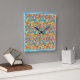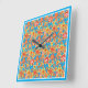 A pretty, square Wall Clock with an all-over pattern of Red, Orange, Yellow flowers on a bright Turquoise background and a Turquoise Blue border, from a handpainted paper collage by Judy Adamson. (Coordinates with the ditsy orange floral collection, Orange Fizz.)