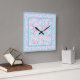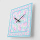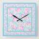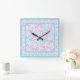 A pretty and feminine large, square Wall Clock, with a pattern of bright pink roses on a sky blue background, dotted with little white butterflies.