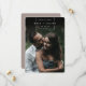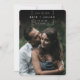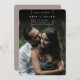A simple and elegant save the date design for modern couples, featuring a vertical photo that fades to black at the top. A white geometric element bears your names, wedding date, and location in chic sans serif and italic lettering. Add additional details to the back. Due to the placement of the design elements, this style is recommended for vertical photos with ample space at the top.
