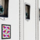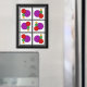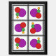 Brightly colored circles stand stacked inside black and gray square frames in this geometric abstract art by Richard H. Fay.