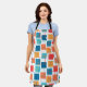 This apron has a geometric design of squares in coral, orange, yellow, and blues scattered about with their outlines.