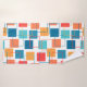 This towel set has a geometric design of squares in tangerine, poppy, coral, and shades of teal scattered about with their outlines.