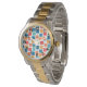 This men's watch has a geometric design of squares in tangerine, poppy, coral, and shades of teal scattered about with their outlines.