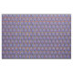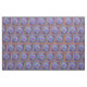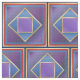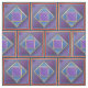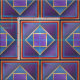 This bold pattern has a purple center, outlined by gold, against a blue background with a texture created by varying shades of blue, then outlined by nested colors of gold, deep purple, blue, red, gold then outlined in a solid dark blue. The squares are patterned into a half brick for additional visual interest.