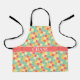 Great color and even though I ordered the kid size, it covers well enough to use during the holidays. I am not a big woman and prefer a shorter apron. I stand 5"6" and the length of the garment goes to mid-thigh. The tie straps fit well at my waist and even though there is no neck strap adjustment, the opening is plenty big enough. I am happy with the size and fit. I am sharing my apron with my 10 year old grandson, too! The color is vibrant and looks good, as shown on the website. The stitching looks strong and reinforced. Photographed is front side and back side of the apron, reinforced straps and coloring. My phone camera may not be the best at showing the details.