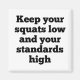 Squats Low Standards High Magnet with a modern and simple typography design saying "Keep your squats low and your standards high" in black. Add your own additional text and/or background color to customize.