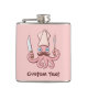 Pink squid chef cartoon with moustache holding knife and cooking fork. Custom background color. Custom text.