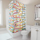 This shower curtain has a mid-century modern design of squiggles running vertically in retro colors with black starbursts and circles scattered about the design.