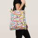 This tote bag has a mid-century modern design of squiggles running vertically in retro colors with black starbursts and circles scattered about the design.