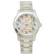 This women's watch has a mid-century modern design of squiggles running vertically in retro colors with black starbursts and circles scattered about the design.