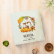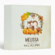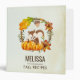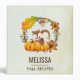 A binder for recipes or other purposes. Designed with a cute squirrel standing behind some orange watercolor pumpkins. A foliage wreath surrounds them with an oak leaf and orange flowers and other sprigs and leaves. Background is a faux vintage parchment in a cream color, with a rough aged look.