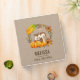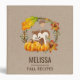 A binder for recipes or other purposes. Designed with a cute squirrel standing behind some orange watercolor pumpkins. A foliage wreath surrounds them with an oak leaf and orange flowers and other sprigs and leaves. The background is a digital image of a paper texture with a rough cardboard look.