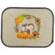 Car mats with a cute squirrel standing behind some orange watercolor pumpkins. A foliage wreath surrounds them with an oak leaf and orange flowers and other sprigs and leaves. Background is a light brown vintage grunge image/texture.