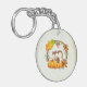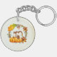 An acrylic keychain with a cute squirrel standing behind some orange watercolor pumpkins. A foliage wreath surrounds them with an oak leaf and orange flowers and other sprigs and leaves. Background is a cream color, with a rough aged look around the edges.