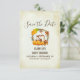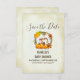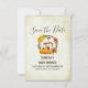 Save the date card for a birthday or baby shower. With a cute chipmunk standing behind some orange watercolor pumpkins. A foliage wreath surrounds them with an oak leaf and orange flowers and other sprigs and leaves. Background is a vintage parchment digital image (the paper is not actual parchment).