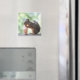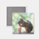 Photo of a squirrel eating an ice cream cone outside on the wooden railing of a back deck. The squirrel is licking a fake cone with what looks like strawberry ice cream...or maybe it's peanut flavored ice cream! A lovely soft green background of evergreen trees contrast with the pink ice cream cone. A funny squirrel picture that anyone who love squirrels or ice cream would enjoy!