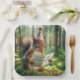 A squirrel stands in a sunlit forest, wearing a festive party hat while holding a birthday card.