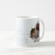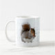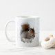 A cute puffy-tailed gray squirrel sits in the snow holding and nibbling a red berry. The image is printed on both sides of this mug. . Mug style, color, and size are customizable.