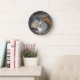 The size of the clock is dramatic and the abstract alcohol ink design is soothing and intricate at the same time. I chose the black frame that adds pop to the blue and gold design. The gold printing would be better in a slightly darker or larger font. I love it and I’m looking for just the right place in ny new apartment. I would recommend this clock for a personal gift or a present. I feel that the quality is excellent for the money! I’m a bit of a clock nut so I’m pretty particular about my purchases. The clock is larger in diameter than many if the clocks I have, so it stands out very well. I think a slightly darker printing color and a moderately larger size would best suit a professional decor or add more impact in a work place item.