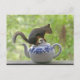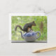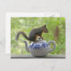 Photo of a squirrel sitting on a white and blue ceramic teapot with Asian fish designs. The picture was taken outdoors with the cute squirrel posing on the teapot. A funny squirrel picture for anybody who likes squirrels or tea!