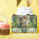 A squirrel stands in a sunlit forest, wearing a festive party hat while holding a birthday card