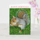 A close up photograph of a cute squirrel printed on a birthday card left blank inside for your own personal message.