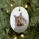 Closeup front view of a squirel with a walnut in its forepaws, looking straight at you. Funny and curious animal. Squirrel symbolises practicality, the necessity to make pleriminary provisions. Ceramic ornament. Christmas Decoration