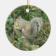 This cute pendant style ornament features a photograph of a cute fluffy grey squirrel clutching an acorn and sitting in a tree in the forest. There is black customizable text on the back for you to personalize this ornament.