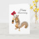 A squirrel holds a bottle of bubbly and a bouquet of red roses on this sweet anniversary card.