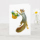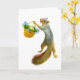 A happy squirrel carries a basket with green grass, blue flowers and a speckled quail egg on this Easter or spring card.