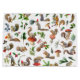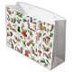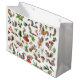 Squirrels hold red mushrooms and green leaves on this colorful winter holiday gift bag.