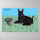 Mister Squirrel in deep conversation with pop and pup black German shepherds.