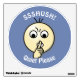 Cartoon figure with finger to lips in typical ssshush gesture, a reminder to keep quiet in libraries and theaters etc.