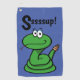 Funny green cartoon rattle snake with big oval eyes, a tongue sticking out of his cheeky grin and a rattle on the end of his tail. Above in black lettering is the word Sssssup! a play on the word Sup! The background is a blue color.