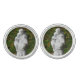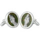 These cufflinks feature a statue of St. Anthony with Christ child among rocks and fallen leaves. It is said that when Saint Anthony died the children cried in the streets and that all the bells of the churches rang of their own accord.