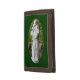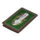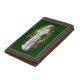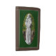 This wallet features a statue of St. Anthony with Christ child among rocks and fallen leaves. It is said that when Saint Anthony died the children cried in the streets and that all the bells of the churches rang of their own accord.