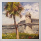 This painting is of the old Spanish fort located in St. Augustine, Florida. The city of St. Augustine was founded by the Spanish, and one of the most enduring legacies is the Spanish fort, now called Castillo de san Marcos, but also known as Fort Marion. The Spanish fort is located at the edge of St. Augustine, and sits on the Matanzas River, built to protect the Colonial Spanish citizens of St. Augustine. The painting is by St. Augustine artist Mary Hubley.