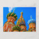 Closeup view of domes of St. Basil's cathedral on Red Square of Moscow, Russia, against blue sky. The cathedral is also know as Vasily the Blessed cathedral and as Cathedral of the Intercession of the Most Holy Theotokos on the Moat. It was consecrated in 1561. The cathedral has no analogues in preceding, contemporary, or later architecture of Muscovy and Byzantine cultural tradition.