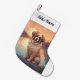 Perfect! Exactly what I ordered! I uploaded a picture of my blue chow, and the screen print was incredible. the back side of the stocking was the red and black checkered print. my puppy's name was also printed on the cuff of the stocking. PERFECT! Highly recommend this product! My puppy's name was screen printed onto the cuff of the stocking, the font was perfect!