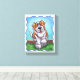 Animal Parade Cute St. Bernard Dog Canvas Print created by Imagine That! Design features our cute tan and white dog character standing in a grassy yard with a red brick fence, a textured blue sky and a playful wavy purple border painted by our talented children's book artist, Traci Van Wagoner. The fun pup stands in play position with one paw raised. This fun pet art is perfect for St. Bernard dog lovers and humorous animal art lovers of all ages. On many of our whimsical St. Bernard doggy products you'll find this cute puppy coming and going with the playful Saint Bernard dog's head on one side and the funny dog's tail on the other. Join the Animal Parade and bring a smile to the face of someone you love with a gift of our cute St. Bernard dog. Woof!