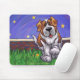 Animal Parade Cute St. Bernard Dog Mouse Pad created by Imagine That! Design features our cute tan and white dog character standing in a grassy yard with a red brick fence, a textured blue sky and a playful wavy purple border painted by our talented children's book artist, Traci Van Wagoner. The fun pup stands in play position with one paw raised. This fun pet art is perfect for St. Bernard dog lovers and humorous animal art lovers of all ages. On many of our whimsical St. Bernard doggy products you'll find this cute puppy coming and going with the playful Saint Bernard dog's head on one side and the funny dog's tail on the other. Join the Animal Parade and bring a smile to the face of someone you love with a gift of our cute St. Bernard dog. Woof!