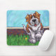 Animal Parade Cute St. Bernard Dog Mousepad created by Imagine That! Design features our cute tan and white dog character standing in a grassy yard with a red brick fence, a textured blue sky and a playful wavy purple border painted by our talented children's book artist, Traci Van Wagoner. The fun pup stands in play position with one paw raised. This fun pet art is perfect for St. Bernard dog lovers and humorous animal art lovers of all ages. On many of our whimsical St. Bernard doggy products you'll find this cute puppy coming and going with the playful Saint Bernard dog's head on one side and the funny dog's tail on the other. Join the Animal Parade and bring a smile to the face of someone you love with a gift of our cute St. Bernard dog. Woof!
