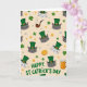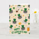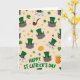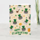 This card shows a repeating pattern of cat faces in soft grey and crisp white, each wearing an emerald-green leprechaun top hat with a golden buckle. The cats have small, content smiles and fine whiskers, and their gentle expressions feel like friendly nods shared across the page 💚. They’re scattered over a warm, creamy beige background, giving the layout an easy, cozy rhythm. Between the faces, bright green shamrocks, shiny gold coins, and little grey puffs of smoke float around like tiny surprises ☘️. Near the bottom, the phrase “HAPPY. ST. CATRICK’S DAY” is set in uppercase lettering, standing out clearly against the beige. A classic pipe with a curling wisp and a frothy mug of golden-amber beer sit among the scattered icons. The hats’ rich green, the coins’ yellow-gold, and the soft grey smoke details repeat across the design in a neat, evenly spaced pattern.