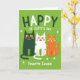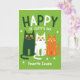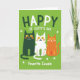 This card features a lime green background that feels like early spring, with small white shamrocks scattered across it ☘️. Near the top, the phrase “HAPPY ST. CATTY’S DAY” sits centered in rounded lettering, standing out clearly against the green. Three stylized cats are lined up in the middle as if posing close together like good friends. On the left is a deep forest green cat with bright yellow eyes and orange whiskers, looking calmly toward the others. Beside it, a white cat with green polka dots leans in with the same gentle smile, as though sharing a quiet joke 💚. On the right, an orange cat with sunny yellow spots and fine white whiskers curls its tail in a soft arc, completing the cozy trio. Below the cats, “Favorite Cousin” appears in soft white text, centered under their paws.