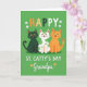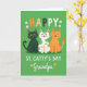 This card shows three cartoon cats lined up across the bottom against a rich St. Patrick’s Day green background, their wide smiles and golden eyes aimed outward like they’re sharing a joke together 💚. A deep emerald cat stands on the left, a white cat with lime-green polka dots sits in the middle, and a ginger tabby with orange spots balances the right side, close enough to feel like a friendly trio. Above them, the word “HAPPY” appears in alternating orange and forest-green letters, with small white shamrocks tucked around it ☘️. Just below, “ST. CATTY’S DAY” is set in bright white, easy-to-read sans-serif text that stretches across the center. Near the bottom, the name “Grandpa,” written in flowing white calligraphy, nestles above the cats and is dotted with tiny orange shamrocks. The colors stay mostly green, white, and orange, giving the scene a cozy, affectionate look, like a lighthearted greeting meant for someone special. The flat, simple shapes keep the focus on the trio of cats and the layered lettering, with white shamrocks popping clearly against the green field.