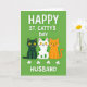 This card shows a lime green background with crisp white text across the top that reads “HAPPY ST. CATTY’S DAY HUSBAND,” setting a sweet, teasing tone 💚. Centered in the middle are three flat, stylized cats standing close together like they’ve leaned in for a friendly photo. The left cat is deep emerald green, the middle cat is white with green polka dots, and the right cat is warm orange with a gently curved tail that softens the lineup. All three have wide yellow eyes, small pink blush on their cheeks, and big smiles that feel like an inside joke shared with someone you love ☘️. Their simple faces and snug spacing make the scene feel cozy and affectionate without needing any extra flourishes. The lettering stays high and easy to read in white, leaving the cats to take up most of the center space. Along the bottom, four white shamrocks are evenly spaced in a neat row beneath the cats.
