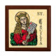 St. Cecilia with Hymn Board is a modern colorized version of an antique woodcut from The Nuremberg Chronicle (Liber Chronicarum). Written by Hartmann Schedal, The Chronicle is an illustrated, encyclopedic account of world history to the end of the 15th century (and beyond to the Last Judgment). Its content was derived from mythology, the Bible, and various Medieval Chronicles. It was published in the city of Nuremberg by Anton Koberger in July 1493 in Latin and, a few months later, in December, in vernacular German. The Chronicle is especially noteworthy for its unprecedented use of illustrations: 645 original woodcuts were produced for its publication. While many woodcuts were reused more than once in the text with the captions simply changed, nevertheless, the volume boasts 1089 pictures in toto. Some copies have contemporary hand-colored illustrations. + Our modern, colorized version of the woodcut appears against a parchment background. + In the original editions of The Chronicle, St. Cecilia's image faces left, a mistake by the artisan who cut the woodblock after the artist's original design. Thus, the text 'reads' backward. We have flipped the image so that St. Cecilia faces right and the writing on the Hymn board is correctly depicted even though illegible. + Despite her private vow of virginity, St. Cecilia was forced into an arranged marriage--never consummated--with a pagan named Valerian. It is said that on her wedding day, St. Cecilia “sang in her heart to the Lord” instead of reveling with her guests. As a result, long before she was associated with organs in art, an iconographical tradition that arose in Italy in the 14th century and was based perhaps on an erroneous reading of a line in her Passio, St. Cecilia was associated with singing and singers. Hence, this 15th-century German illustration gives her a hand-held Hymn board as an attribute. As here, such handheld boards originally bore the opening lines of a hymn that would be sung during a religious service. Today's freestanding or wall-hung Hymn boards are posted with numbers instead, numbers that coincide with a given congregation's hymnal. + Feast: November 22 + Image Credit (St. Cecilia with Hymn Board): This colorized version of the Nuremberg woodcut is a Saints_Aplenty Exclusive (SAE).